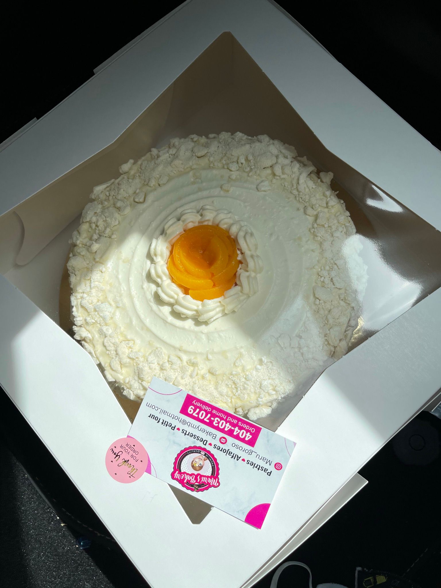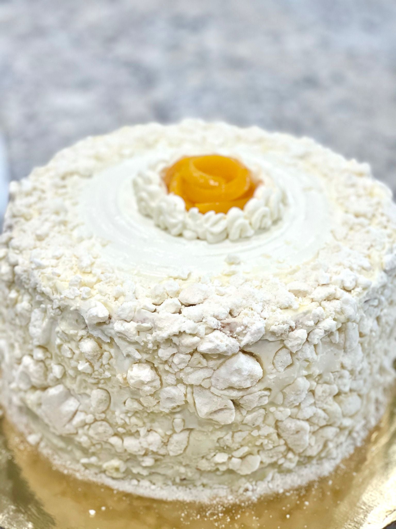 Delicious vanilla sponge cake filled with peach cream and dulce de leche covered with meringues and decorated with peaches on top.