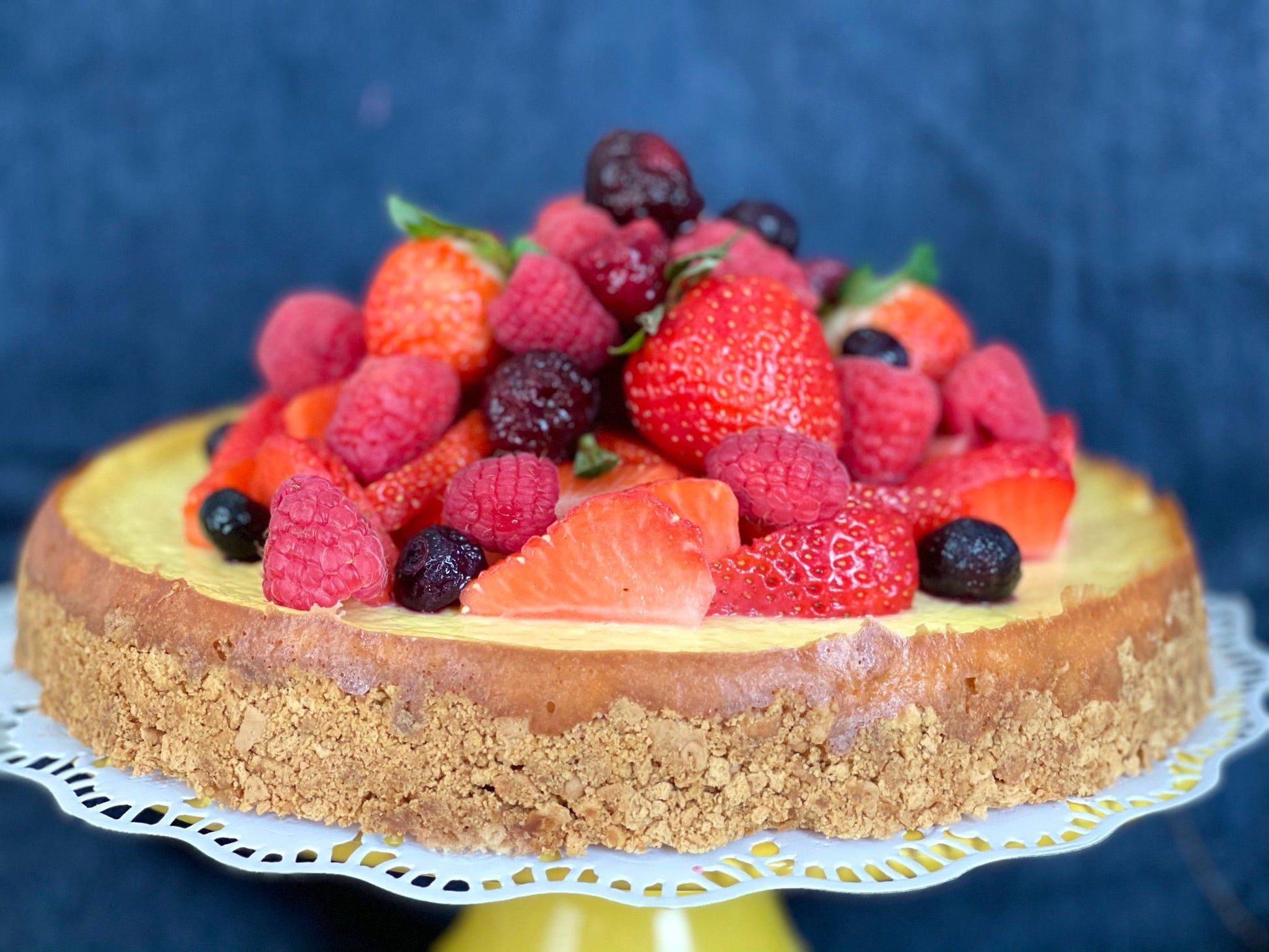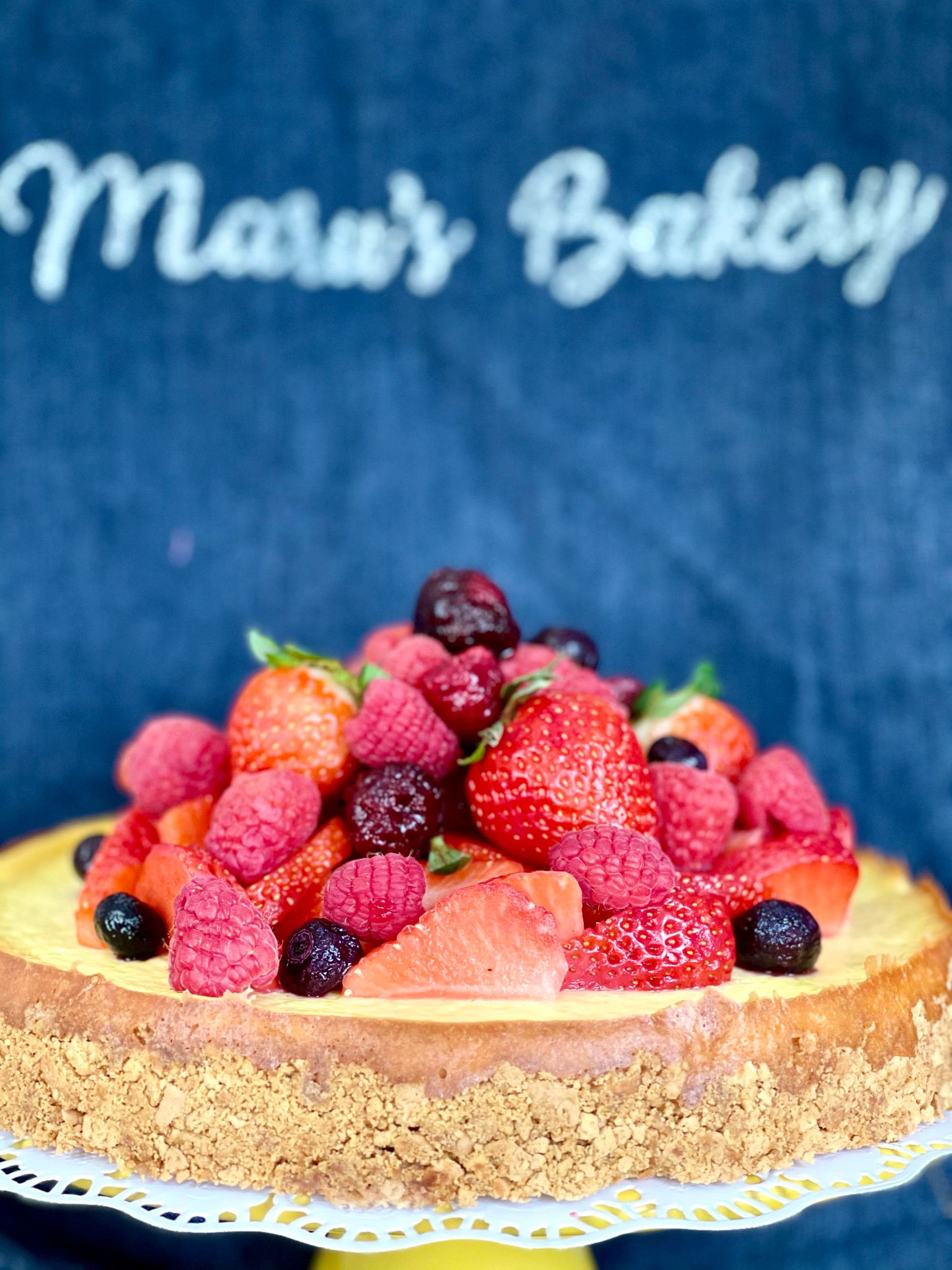 NY Cheesecake: Vanilla cookie base, rich cheesecake filling, topped with red berries and mint leaves.