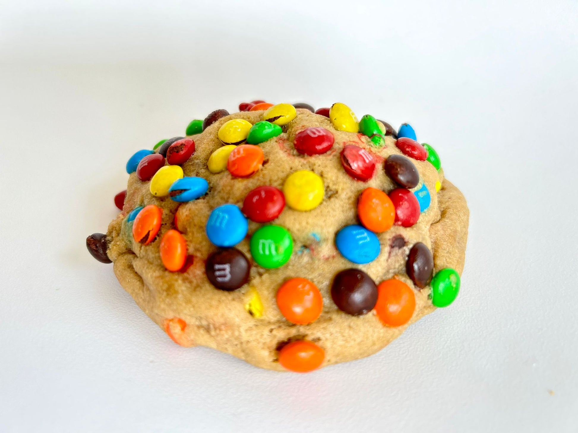 Butter, brown sugar / white sugar, egg, flour, salt, cornstarch, baking soda, M&M's chocolates decorated with endless m&ms on top, Callebaut sweet and dark.